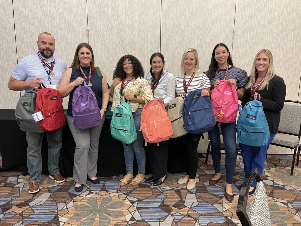 In the team building activity School Supply Scramble, groups compete to earn backpacks and supplies to donate to a children’s charity.